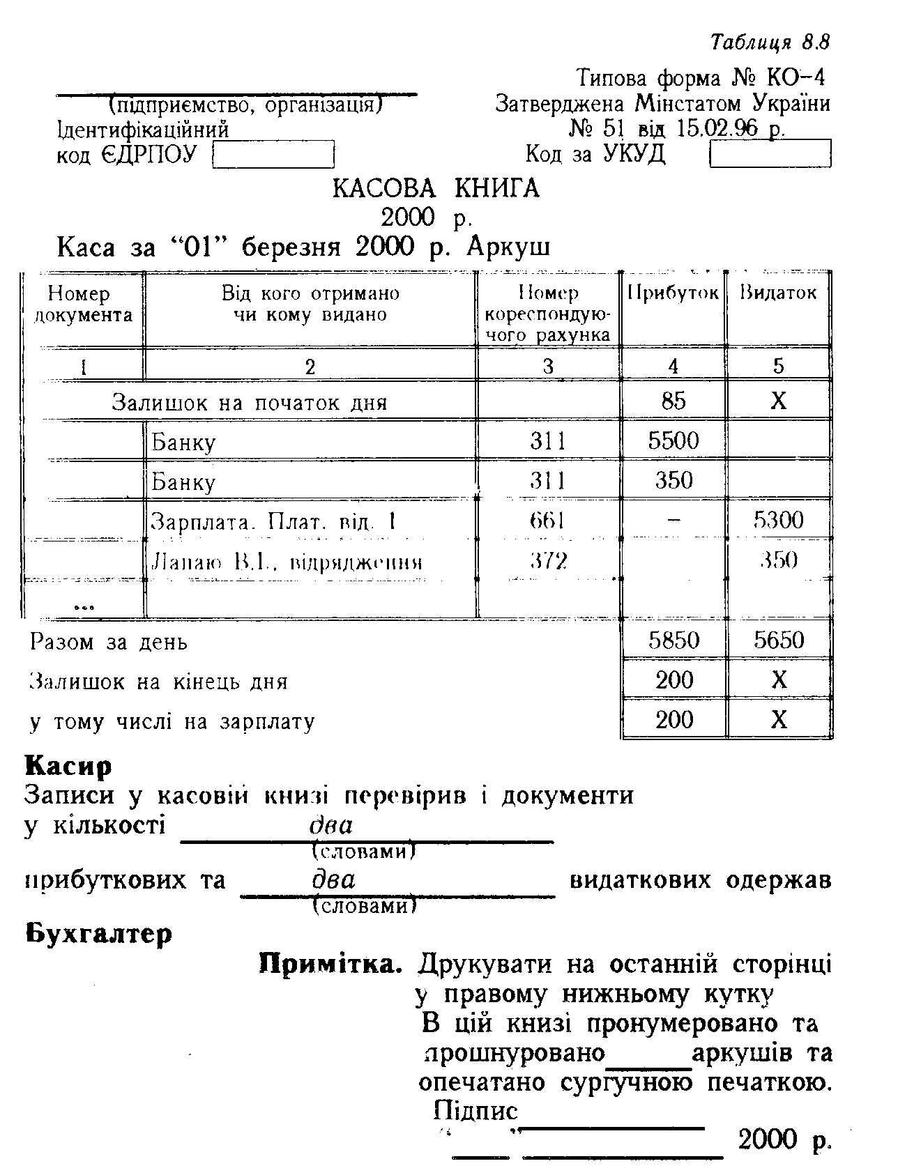 На підприємстві ведеться тільки одна Касова книга (типова форма № КО-4) в національній валюті, в якій касир відображає готівку і рух грошей у касі (форма наведена у табл. 8.8). Записи у Касовій книзі здійснюються за кожним Прибутковим і Видатковим ордером. Але якщо в організації є інші види валют, крім національної, то Касові книги відкриваються на кожну валюту окремо.