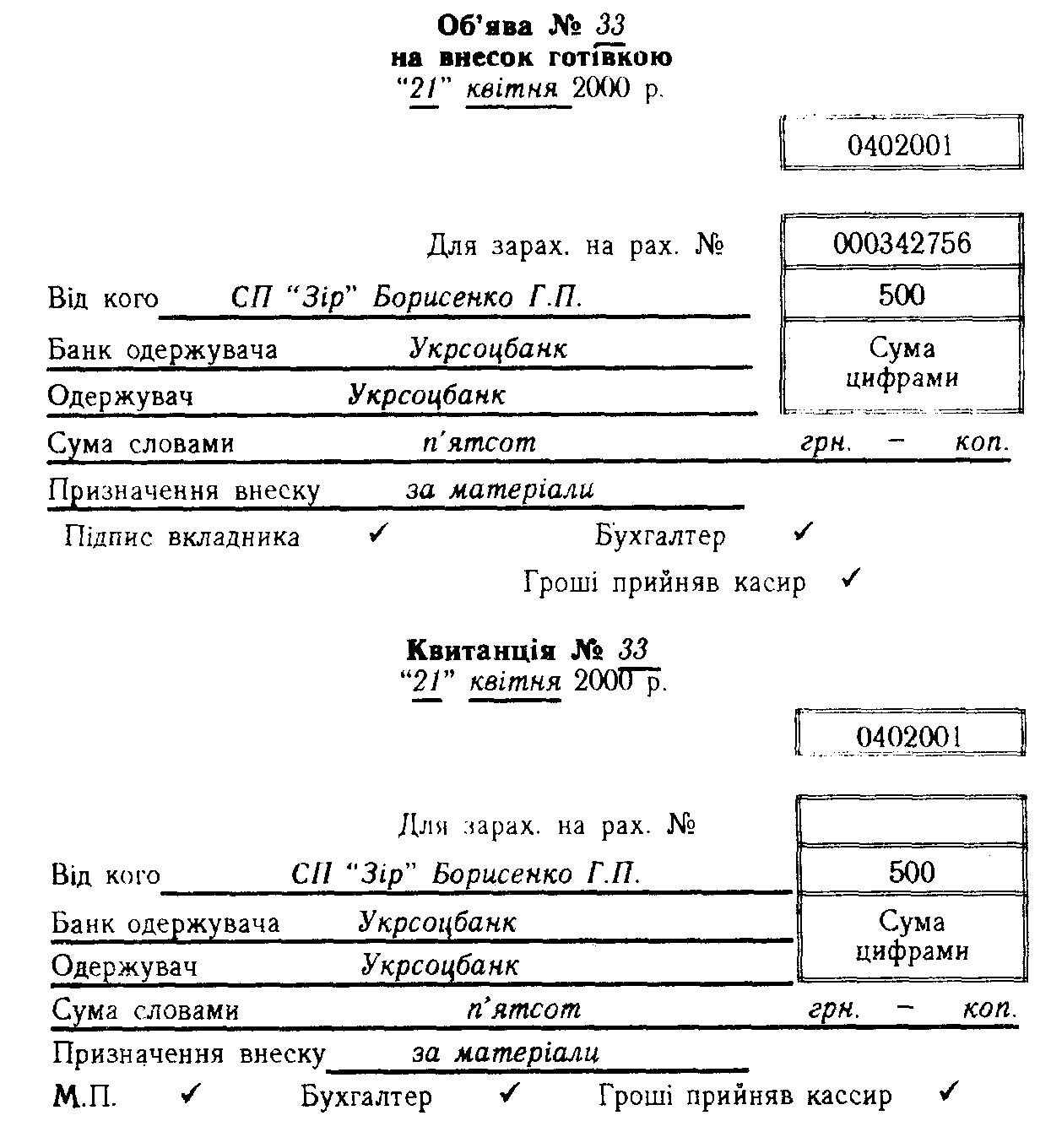 На кожній з трьох частин зазначаються: дата, від кого прийнята готівка, банк одержувача і одержувач, призначення внеску. У правому верхньому кутку першої та другої частин зазначаються номер свого розрахункового рахунка та сума цифрами. Та ж сума записується словами у такому порядку:
