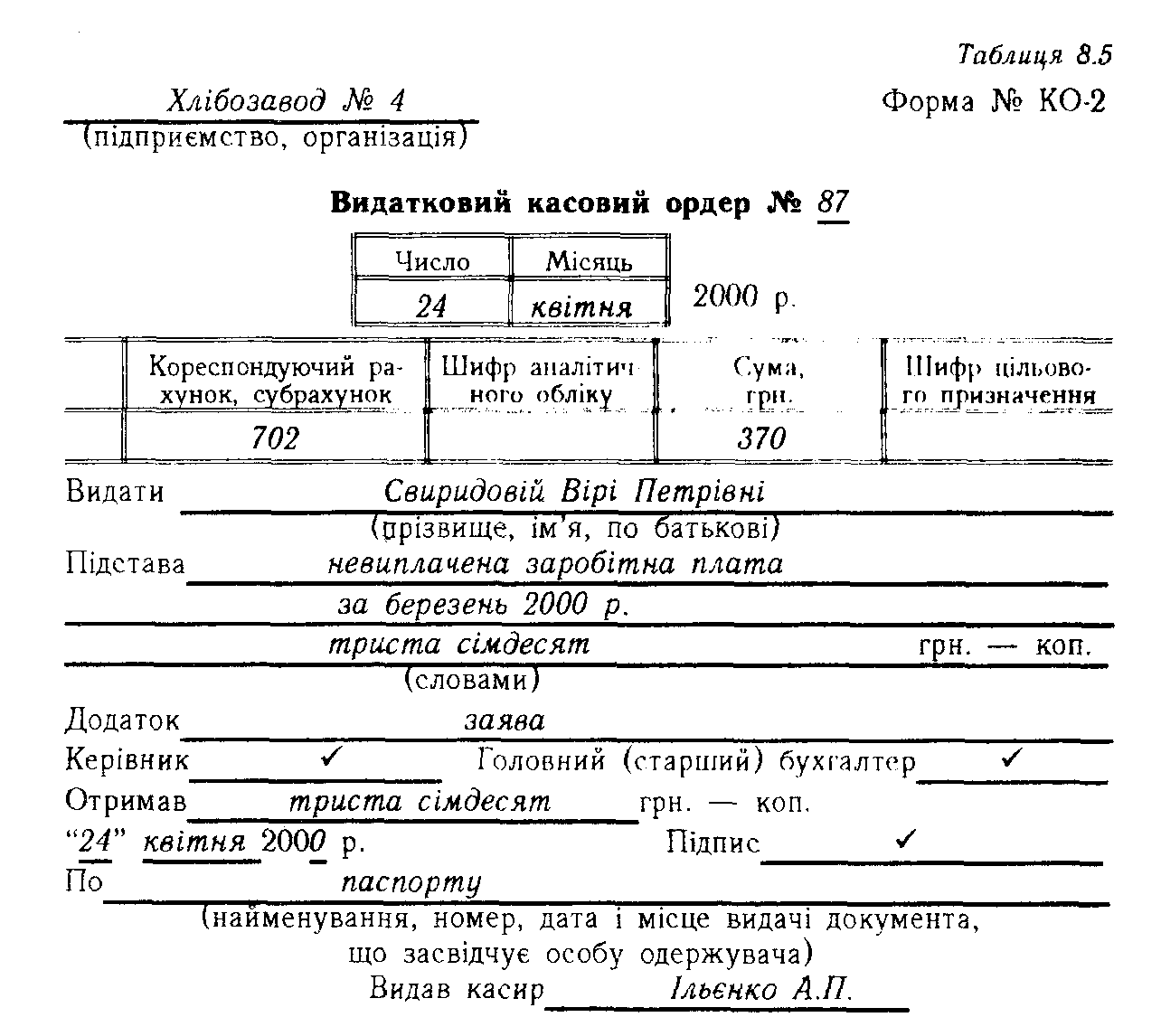 Надходження і видачу грошей з каси підприємства оформлюють прибутковими й видатковими касовими ордерами, які виписує бухгалтерія, за формами № КО-1 і № КО-2 (табл. 8.4, 8.5).