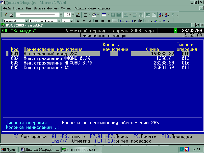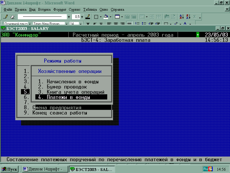 Система дает возможность автоматически сформировать платежные поручения на перечисления в фонды. Для этого, войдя в режим “Хозяйственные операции”, откройте пункт “Платежи в фонды” (Рисунок 7). На экране появится список платежей в фонды. Клавишей Insert отметьте все перечисления. Для формирования платежных поручений сначала необходимо произвести расчет сумм платежей, нажав клавишу F10. В том случае, если отмеченных позиций по платежам нет, по клавише F10 производится расчет текущего платежа, т.е. того платежа, на котором в данный момент стоит курсор.