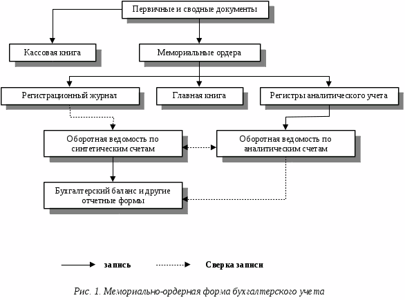 При мемориально-ордерной форме учета по данным первичных или накопительных документов составляют мемориальные ордера, которые записываются в регистрационный журнал и затем в Главную книгу (регистр синтетического учета). Аналитический учет ведется в карточках, записи в которые делают на основании первичных или сводных документов. По данным синтетических и аналитических счетов по окончании месяца составляют оборотные ведомости, которые сверяются между собой.