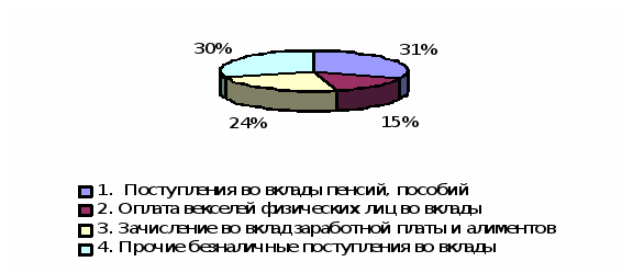 В общем объеме поступлений наиболее широко используется такой вид платежа, как поступления во вклады пенсий и пособий. Эта услуга не так давно представлена Сберегательным банком (в частности Липецким ОСБ № 8593) своим клиентам и хорошо себя зарекомендовала. Также возросло перечисление во вклады заработной платы и алиментов работников: с 17,1% в 2005 году до 23,6% в отчетном 2007.