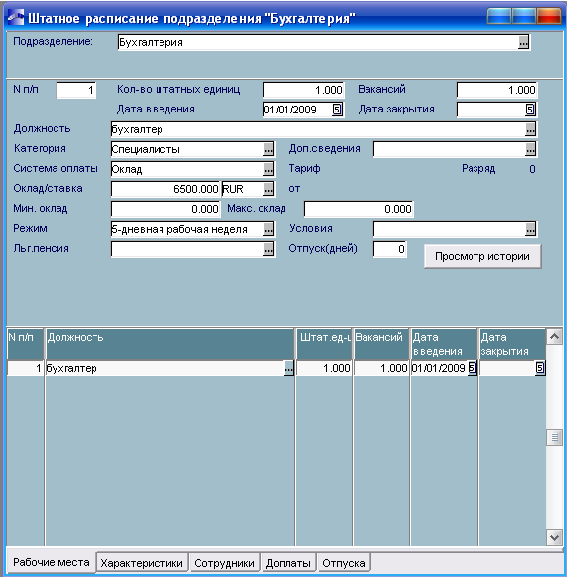 Штатное расписание единицы бухгалтерия содержит одну строку с соответствующими значениями столбцов.