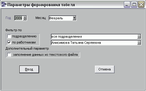 Выполним пункт меню Расчет затрат \Табель учета рабочего времени \Формирование табеля, получим окно = Параметры формирования табеля = [Приложение 14].