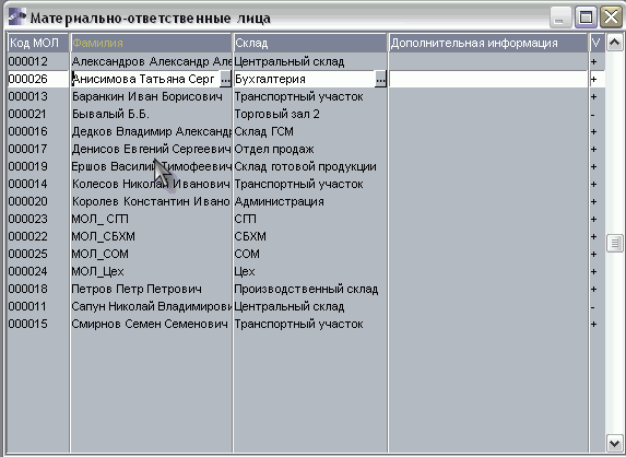 Фамилию МОЛ можно выбрать из каталога сотрудников предприятия, который создается в модуле Управление персоналом, в этом случае формируется ссылка на соответствующую запись в этом каталоге. Данная ссылка необходима для того, чтобы в разноске типовых хозяйственных операций установить связь материально-ответственного лица и сотрудника предприятия. О наличии ссылки говорит знак "+ " впоследней колонке V. Следует помнить, что ссылка теряется при попытке редактирования поля Фамилия. При необходимости в этом случае ссылку можно установить повторно, предварительно отредактировав фамилию в каталоге сотрудников предприятия.