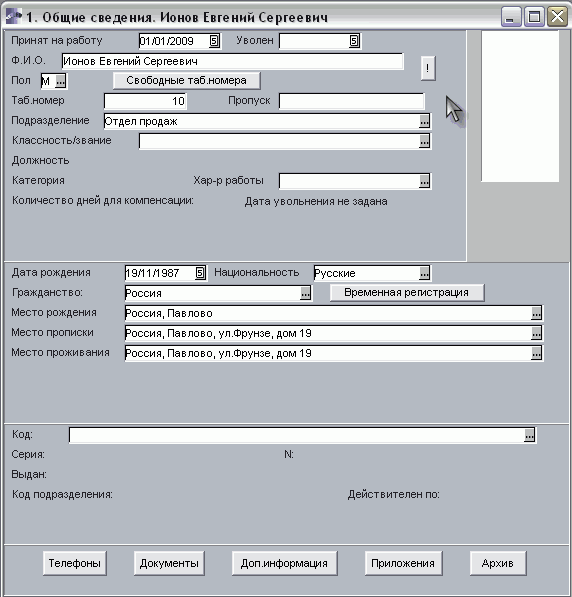 Заводим карточки на 2-х работников. Через пункт меню ( База Данных ) Картотека сотрудников открываем список работающих сотрудников. По команде ( F7) новая открываем первое окно сведений о сотруднике. Вносим соответствующие сведения [Приложение 7 и Приложение 8].
