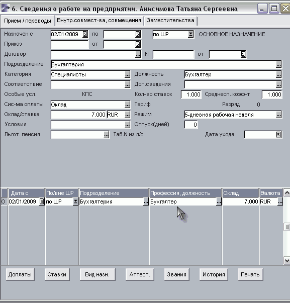 При наличие табельного номера на работника открывается лицевой счёт для начисления заработной платы. О каждом сотруднике в БД храниться подробная информация, которая вводиться и отображается в последовательности окон, выводимым нажатием кнопки ( Ctrl – enter следующие). Нажимаем 5 раз ( Ctrl – enter следующие) или клавиши alt + 6, получаем шестое окно = сведения о работе на предприятии =[Приложение 9 и Приложение 10].