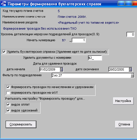 Выполняем пункт Расчет зарплаты \Расчет зарплаты \Предварительная разноска. В окне = Параметры предварительной разноски = задаем фильтр по 2-м подразделениям: бухгалтерия и отдел продаж [Приложение 19].