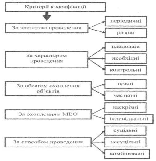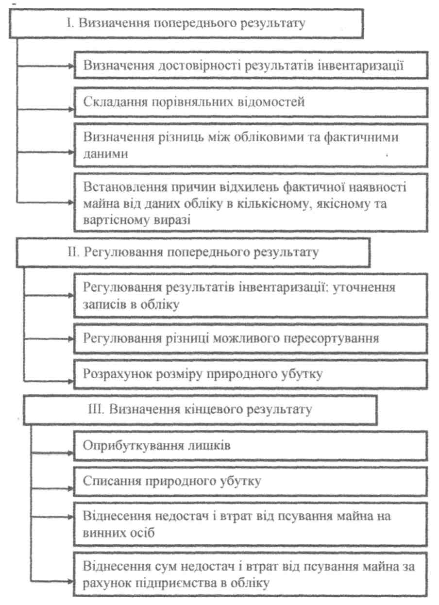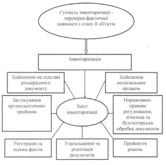 Під інвентаризацією слід розуміти перевірку та оцінку фактичної наявності об'єкту контролю, яка здійснюється шляхом спостереження, вимірювання, реєстрації з подальшим порівнянням отриманих даних з обліковими показниками. Інвентаризації притаманний комплекс наступних господарсько-правових ознак: здійснення на підставі розпорядчого документу колегіальним органом: виявлення кількісних і якісних характеристик об'єкту; реєстрація та оцінка фактів; нормативно-правове регулювання; бухгалтерська обробка документів; узагальнення та реалізація результатів; прийняття рішень (див. рис. 1.1).
