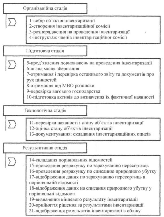 7. Виділення в інвентаризаційному процесі таких стадій, як організаційна, підготовча, технологічна і результативна дозволяє представити інвентаризаційний процес у вигляді алгоритму, що суттєво спрощує роботу інвентаризаційної комісії.
