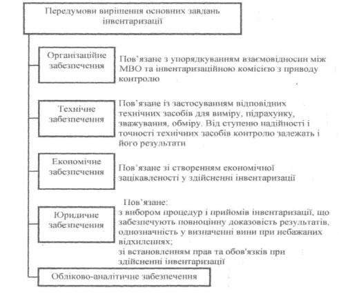 Для вирішення основних завдань, що розв'язуються в процесі інвентаризації, необхідним с організаційне, технічне, економічне, юридичне та обліково-аналітичне забезпечення (див. рис. 1.3).