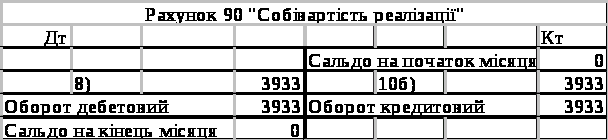 Списано собівартість реалізованої готової продукції: Дебет 901 «Собівартість реалізованої готової продукції» Кредит 26. Наприкінці звітного періоду рахунок 901 закривається і сума на ньому по кредиту списується на дебет рахунку 79 «Фінансові результати». У випадку, коли підприємства для узагальнення інформації про витрати застосовують тільки рахунки класу 8, операцію «Списано на фінансові результати первісну вартість готової продукції» буде відображено по дебету на рахунку 791 «Результат основної діяльності» та по кредиту на рахунку 26 «Готова продукція».