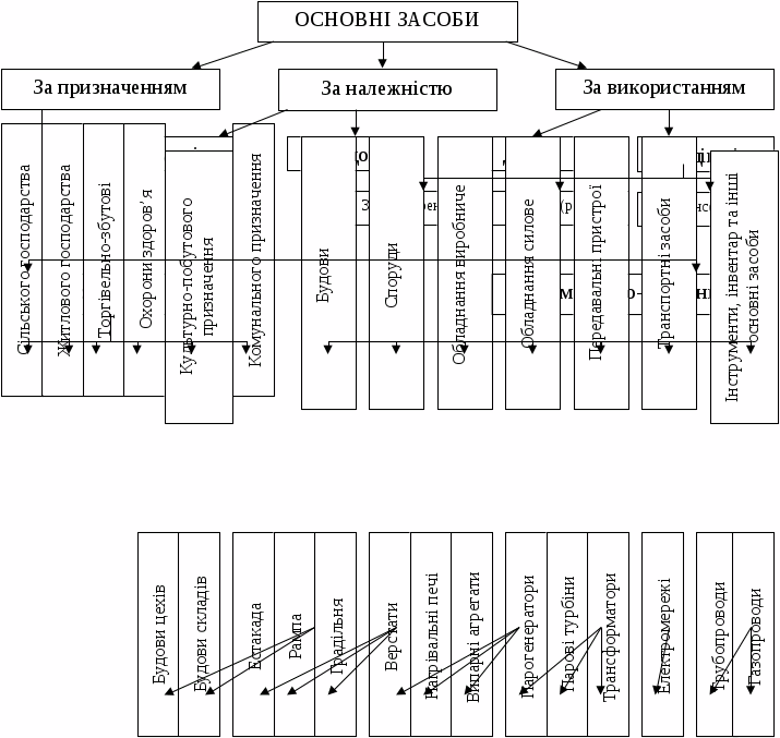 Основні засоби в Україні можна згрупувати за їх функціональним призначенням, за галузевою ознакою, за використанням, за ознакою належності, за натурально-матеріальним складом (рис. 1.1).