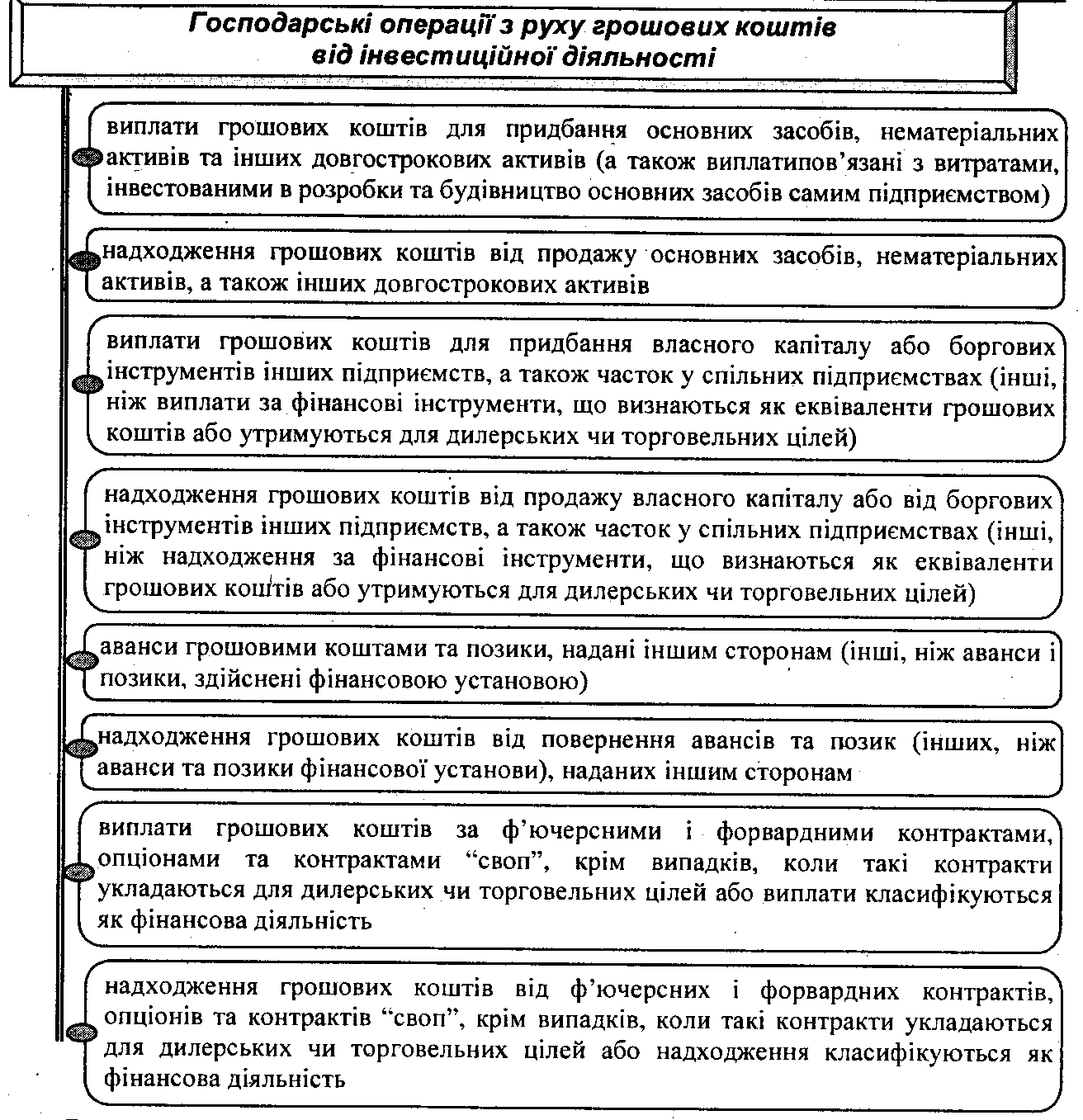 Окреме розкриття руху грошових коштів, який виникає від інвестиційної діяльності, є важливим, оскільки рух грошових коштів відображає, якою мірою здійснювались витрати на ресурси, призначені для генерування майбутнього прибутку і майбутнього руху грошових коштів. Прикладами руху грошових коштів від інвестиційної діяльності є, зокрема наступні операції (рис. 2.2).