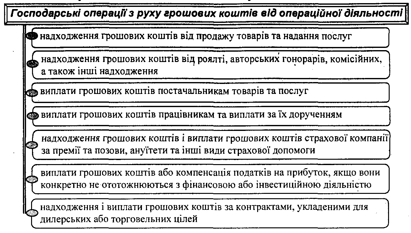 Сума руху грошових коштів від операційної діяльності є ключовим показником того, якою мірою операції підприємства генерують грошові кошти, достатні для погашення позик, підтримки операційної потужності підприємства, виплати дивідендів та здійснення нових інвестицій без залучення зовнішніх джерел фінансування. Інформація про конкретні компоненти руху первинних грошових коштів є корисною разом з іншою інформацією для прогнозування майбутнього руху грошових коштів від операційної діяльності. Приклади господарських операцій з руху грошових коштів від операційної діяльності наведено на рис. 2.1.