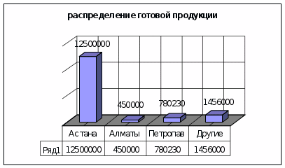 Данные графика показывают, что большее количество готовой продукции предприятия было реализовано за период 2004 года в городе Астана, что в стоимостном выражении составило 12 500 000 (Двенадцать миллионов пятьсот тысяч) тенге.