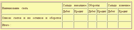 Здесь для каждого синтетического счета, задействованного в ведении учета, предусматривается отдельная строка, в которой записывается наименование этого счета, сальдо на начало периода, обороты за период и сальдо на конец периода. В итоговой строке должно быть три пары равнх между собой итогов - сальдо на начало периода по дебету и по кредиту, сумма оборотов по дебету и кредиту за период, сальдо на конец периода по дебету и по кредиту. Первое и третье равенство определяется равенством актива и пассива баланса. Второе равенство выполняется по правилу двойной записи - каждая сумма попадает в дебет одного счета и в кредит другого счета, таким образом, учитывается и в суммарном дебетовом обороте, и в суммарном кредитовом обороте.