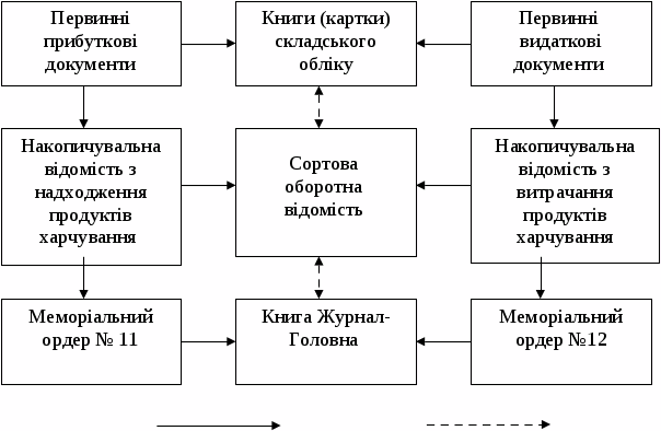 Мають особливості побудова і порядок ведення меморіальні ордери №11 “Зведення накопичувальних відомостей про надходження продуктів харчування ф. № 398 (бюджет) і № 12 “Зведення накопичувальних відомостей про витрачання продуктів харчування” ф. № 411 (бюджет). Схема обліку продуктів харчування приведена на рис.3.