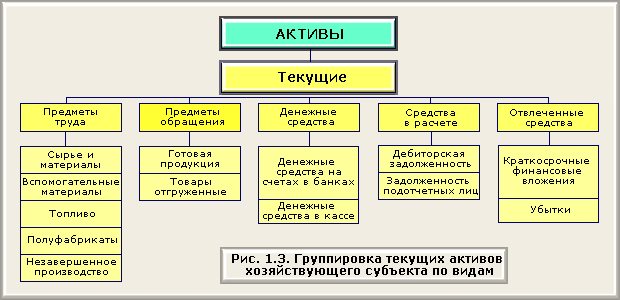 В составе текущих активов выделяются и отвлеченные активы. Они могут быть представлены краткосрочными финансовыми вложениями и убытками. Убытки - это потеря активов в результате нерационального хозяйствования или стихийных бедствий. Данная часть активов полностью выбывает из хозяйственного оборота. Однако на каждом предприятии установлен контроль за убытками по времени их возникновения и порядком их покрытия. Группировка активов по видам представлена на рис. 1.1.