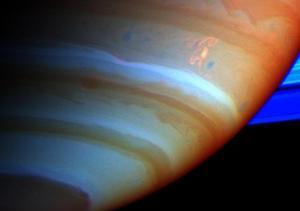 Южное полушарие Сатурна. "Ураган Дракона", он хорошо виден на этом изображении, полученном в ближней ИК-области (цвета на рисунке искусственные). Исследуя результаты, полученные Кассини, ученые обнаружили, что "Ураган Дракона" является причиной таинственных вспышек в радиодиапазоне. Возможно, мы видим гигантскую грозу на Сатурне, когда радиошум возникает из-за высоковольтных разрядов в молниях