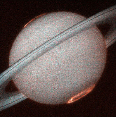 Это снимок полярного сияния Сатурна, сделанный в ультрафиолете двумерным спектрографом (STIS) космического телескопа. Расстояние до Сатурна - 1.3 млрд. км. Полярное сияние имеет вид кольцевого занавеса, окружающего оба магнитных полюса планеты. Занавес поднимается более чем на полторы тысячи километров над поверхностью облаков Сатурна.