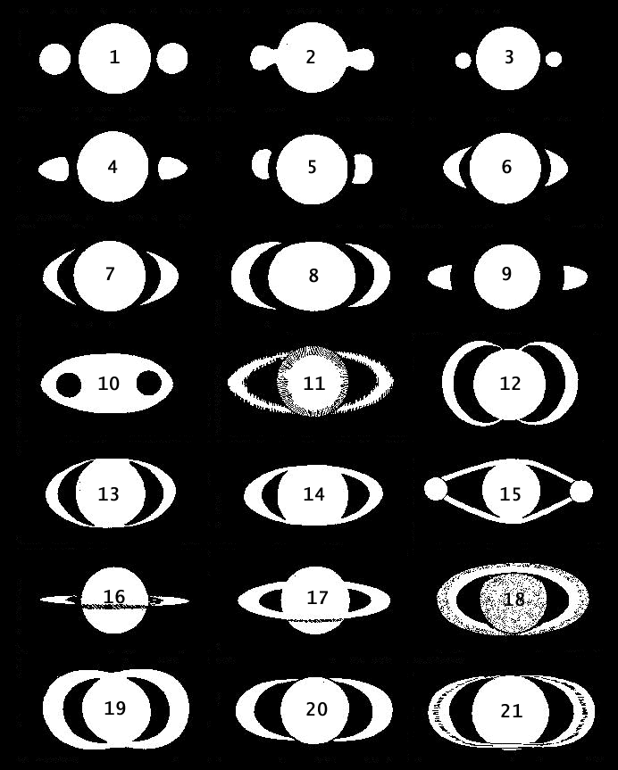 Кольца Сатурна видимы с Земли в небольшой телескоп. Они состоят из тысяч и тысяч небольших твердых обломков камней и льда, которые вращаются вокруг планеты.