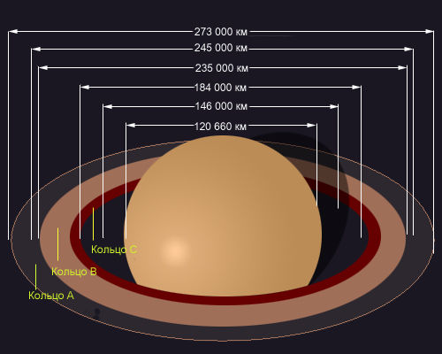 С Земли в телескоп хорошо видны три кольца: внешнее, средней яркости кольцо А; среднее, наиболее яркое кольцо В и внутреннее, неяркое полупрозрачное кольцо С, которое иногда называется креповым. Кольца чуть белее желтоватого диска Сатурна. Расположены они в плоскости экватора планеты и очень тонки: при общей ширине в радиальном направлении примерно 60 тыс.км. они имеют толщину менее 3 км. Спектроскопически было установлено, что кольца вращаются не так, как твердое тело, - с расстоянием от Сатурна скорость убывает. Более того, каждая точка колец имеет такую скорость, какую имел бы на этом расстоянии спутник, свободно движущийся вокруг Сатурна по круговой орбите. Отсюда ясно: кольца Сатурна по существу представляют собой колоссальное скопление мелких твердых частиц, самостоятельно обращающихся вокруг планеты. Размеры частиц столь малы, что их не видно не только в земные телескопы, но и с борта космических аппаратов.