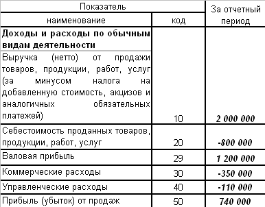 Строка "Валовая прибыль" - разница между выручкой от продажи и себестоимостью проданных товаров, работ, услуг. Строка "Коммерческие расходы" - дебетовый оборот субсчета "Себестоимость продаж" счета 90 в корреспонденции со счетом 44. Строка "Управленческие расходы" - дебетовый оборот субсчета "Себестоимость продаж" счета 90 в корреспонденции со счетом 26. "Прибыль (убыток) от продаж" - разность между валовой прибылью и всеми расходами.