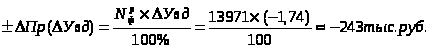 Прибыль от продаж зависит от изменения объёма розничного товарооборота, среднего уровня валового дохода, уровня налогов, взимаемых за счёт реализованных торговых надбавок и среднего уровня издержек обращения. Их влияние на прибыль определим приёмом абсолютных разниц: