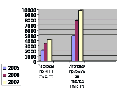 По строке 140 в отчете о прибылях и убытках проходит информация о расходах КПН. Увеличение расходов по этому показателю составляет в 2006 г. на 1 303 294,35 тенге больше по отношению к 2005г. И в 2007г. На 2 126 054,72тг. больше, чем в 2005г, и на 822 760,42тг. Больше чем в 2006г.
