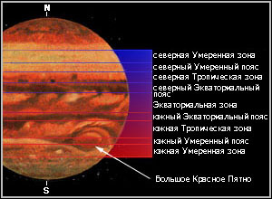 Толщина атмосферного слоя, в котором возникают все эти удивительные облачные структуры, - 1000 км. Темные полосы и светлые зоны, параллельные экватору, соответствуют атмосферным течениям разного направления (одни отстают от вращения планеты, другие его опережают). Скорости этих течений – до 100 м/с.