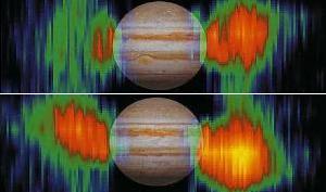 Эти два изображения показывают радиационные пояса Юпитера в течение 10 часов. Они контролируются магнитным полем планеты, поэтому изменяются при ее вращении. Изображение планеты дано для того, чтобы показать относительный размер этих поясов. При облете Юпитера основная антенна «Кассини» была все время направлена в сторону планеты, что позволило записать данные об интенсивности радиоизлучения в полосе, охватывающей почти четверть оборота Юпитера. Впервые был записан спектр высокоэнергетичных электронов в окружающем пространстве Юпитера. Оказалось, что плотность этих электронов меньше, чем предполагалось ранее, а это означает, что гораздо больше электронов, чем ожидалось, обладают меньшей энергией, а именно они и представляют основную опасность для электронного оборудования космических аппаратов. Результаты наблюдений показали, что район Юпитера представляет зону самого жесткого радиационного окружения во всей Солнечной системе, а максимально жесткое излучение наблюдается на расстоянии до 300 тыс. км от его поверхности.