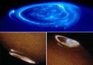 На недавно опубликованной фотографии с Космического телескопа имени Хаббла, сделанной в ультрафиолетовых лучах, полярные сияния выглядят как кольцеобразные пояса вокруг полюсов планеты. Полярные сияния на Юпитере отличаются от земных наличием ряда ярких полос и пятен, порождаемых трубками магнитного поля, что соединяют Юпитер с его крупнейшими спутниками. В данном конкретном случае яркая черточка у самого левого края и два ярких пятнышка – одно чуть пониже центра и другое справа от него – представляют собой ни что иное как следы Ио, Ганимеда и Европы, соответственно. Следует заметить, что снята дневная сторона Юпитера (с Земли можно снять только узкую ночную полоску) и в ультрафиолете сияние ярче отраженных солнечных лучей.