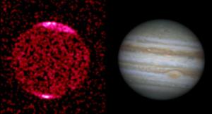 Самая большая планета солнечной системы, газовый гигант Юпитер, знаменит своим похожим на водоворот Большим Красным Пятном. Справа показано оптическое изображение знакомой всем гигантской планеты с циклоническими системами и полосами облаков, полученное пролетавшим около нее космическим аппаратом Кассини. Слева показано в искусственных цветах соответствующее изображение Юпитера в рентгеновских лучах, полученное орбитальной обсерваторией Чандра. На