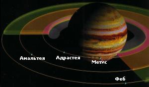 Схематическое изображение кольцевой системы Юпитера показывает соотношение между различными кольцами и его мелкими внутренними спутниками, которые являются источником пыли, формирующей кольца. Самое внушительное кольцо, показанное серым оттенком, - это гало. Тонкое узкое основное кольцо показано красным цветом, на его границе расположены спутники Адрастея и Метис. Кольцо состоит из частиц, выбиваемых из этих двух спутников. Феб и Амальтея более удалены от Юпитера и формируют тонкие паутинообразные кольца, которые обозначены желтым и зеленым цветами.