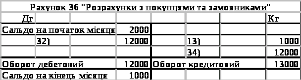 По даних Журналу реєстрації господарських операцій за звітний період складаємо бухгалтерські рахунки у вигляді Т-моделі, записуємо в них залишки на початок звітного періоду з Таблиці 3. Для активних рахунків сальдо початкове проставляємо у лівій частині (рахунки 10, 12, 20, 22, 23, 26, 30, 31, 36, 372), для пасивних – у правій (рахунки 40, 43, 44, 50, 60, 63, 64, 65, 66).
