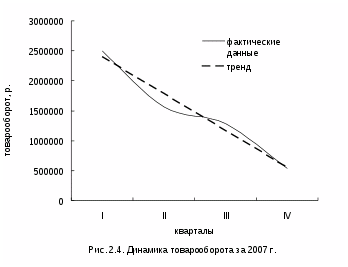 Из вышеприведенного анализа можно сделать вывод о том, что деятельность ООО «БРВ – Краснодар» нельзя назвать достаточно эффективной. Об этом свидетельствуют и данные таблицы 2.2.5., характеризующие состояние организации как неустойчивое, и данные таблицы 2.4.2., которые показывают, что прибыль от продаж и рентабельность продаж за 20062007 гг. сократились соответственно на 14,4% и 0,78%, и данные графика 2.4., иллюстрирующего снижение объема товарооборота за 2007 год.