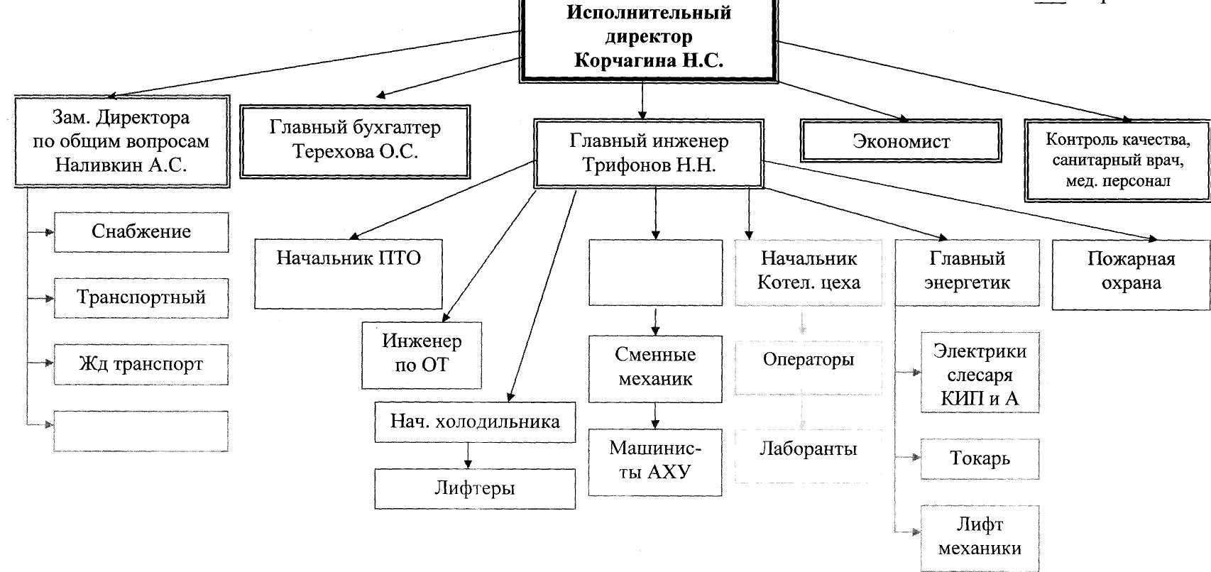 Руководство текущей деятельностью Общества осуществляется исполнительным директором. Исполнительному директору подчиняются заместитель директора по общим вопросам, главный бухгалтер, главный инженер, экономист, санитарный врач, которым в свою очередь подчиняется весь остальной персонал.