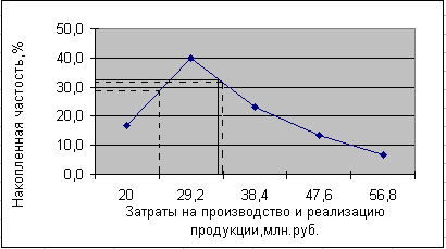 С вероятностью 0,954 ошибка выборки средней суммы затрат на производство и реализацию продукции составит 3,3661 млн. руб. Средние затраты на производство и реализацию продукции в генеральной совокупности находятся в интервале от 30,7439 млн. руб. до 37,4761 млн. руб.