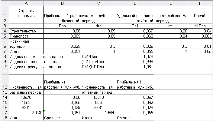 4. Общие индексы динамики прибыли в расчёте на одного работника по трём отраслям в целом. Построим систему индексов в агрегатной форме с использованием относительных показателей структуры (удельных весов).