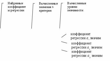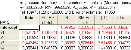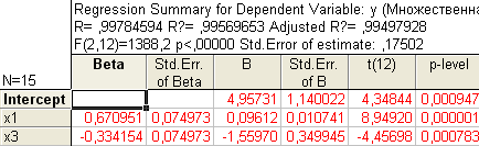 Коэффициент регрессии а>0>>,> a>1>,> >a>2>,…,a>m>> >признается значимым, если рассчитанное системой Statistica для него значение уровня значимости р меньше (или равно) 0,05 (для 95%-ной доверительной вероятности). |