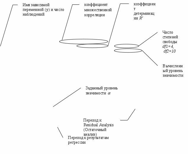 Осуществив переход к результатам регрессии (Summary: Regression results) получаем уравнение линейной множественной регрессии вида y(x>1>, x>2>, x>3>, x>4>)=6,9+0,07x>1> –0,00035x>2>–2,08x>3>+0,00003x>4>: