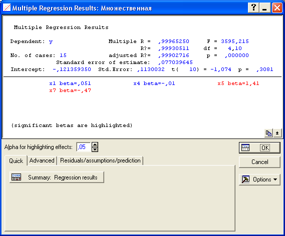 Проверяется нулевая гипотеза H>0>> >о равенстве полученных коэффициентов регрессии нулю: a>0>=a>1>=a>2>=…=a>m>=0. Для этого рассчитанное системой Statistica значение F-критерия (F>расч>), сравнивается с табличным значением F>табл>, определяемым с использованием специальных таблиц по заданным уровню значимости (например, =0,05) и числу степеней свободы (df1=m, df2=n-m-1). Если выполняется неравенство F>расч> < F>табл>, то с уверенностью, например на 95 %, можно утверждать, что рассматриваемая зависимость y = а>0> + a>1>x>1>+ … +a>m>x>m> является статистически значимой. |
