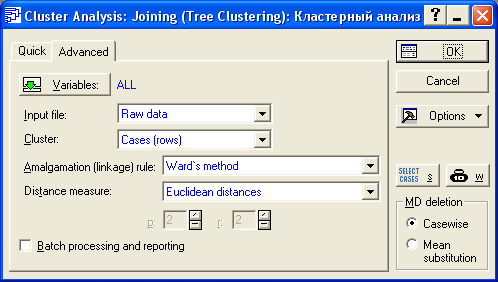 Используемый метод – Ward’s method – метод Уорда, который хорошо работает с небольшим количеством элементов и нацелен на выбор кластеров с примерно одинаковым количеством членов. В качестве метрики расстояния пакет предлагает различные меры, но наиболее употребительными являются Euclidean distance (евклидово расстояние). При кластеризации элементов в пакете STATISTICA следует выбирать режим: cases (rows) – строки, а при кластеризации факторов: variables (columns) – столбцы. В качестве переменных для рассматриваемого примере следует выбрать все переменные (all).