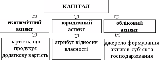 Дослідження власного капіталу потребує з’ясування сутності капіталу. Найважливішими аспектами розкриття сутності капіталу є економічний, юридичний, обліковий (рис. 1).