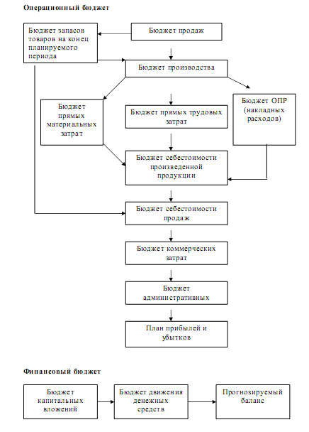 Генеральный бюджет производственного предприятия также состоит из операционного и финансового бюджетов. Как и в случае с торговой организации, все частные бюджеты здесь также взаимосвязаны.