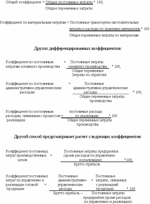 Отличительной чертой этой системы является применение способов распределения постоянных общих затрат по видам продукции. Один из способов предполагает расчет коэффициентов:
