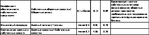 Коэффициент обеспеченности собственными средствами характеризует наличие собственных источников финансирования оборотных активов предприятия, необходимых для поддержания нормального функционирования бизнеса. Рекомендованное значение для этого показателя – от 0,1 и выше. У предприятия этот показатель практически в норме, однако следует помнить, что источники финансирования оборотных средств в торговом предприятии в основном – заемные..