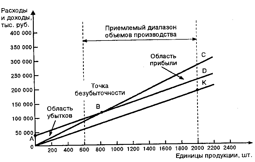 Постоянные издержки считаются постоянной величиной для всего диапазона объема производства. Сумма постоянных издержек в размере 40000000 руб. прибавляется к переменным издержкам, в результате линия совокупных издержек параллельна линии переменных издержек. Маржинальный доход представлен на графике между линией дохода от реализации (оС) и линией переменных затрат. Приемлемый диапазон задач - в пределах от 600 до 2000 шт. единиц продукции.