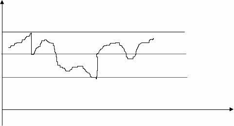 Таким образом, в 2007 г. оптимальный остаток денежных средств предприятия должен был находиться в пределах интервала (61;84,95) с точкой возврата – 68,98 тыс. руб. Фактически же денежных средств было 309 тыс. руб., что было выше оптимально допустимой верхней граница на 224,05 тыс. руб. В 2008 г. оптимальный интервал (41,7;63,6), фактическое наличие денежных средств было выше оптимума на 159,4 тыс. руб. В 2009 г. практически противоположная картина, сопровождающаяся самым значительным отклонением средств на расчетном счете и в кассе ООО «Климовская деревообрабатывающая компания» - оптимальный интервал (109,7;140,07), что выше фактического остатка на 444,07 тыс. руб. Это говорит о неумении предприятия распоряжаться денежными средствами, их недоиспользовании и замораживании. То есть средств у предприятия не хватает на осуществление ежедневной текущей хозяйственной деятельности, а их излишки вполне могли бы быть направлены на финансовую или инвестиционную деятельность для получения дополнительного дохода. Так, рассчитав модель Миллера-Орра для ООО «Климовская деревообрабатывающая компания» в 2009 г., можно построить график управления денежными средствами (рис. 6).